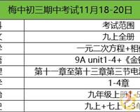 【家长帮】梅岭中学初三期中考试时间及范围汇总各位梅中初三年级的家长、同学们,大家好!根据学校安排,初三年级本学期期中考试即将举行。为了方便大家更好地进行复习备考,现将具体的考试时间和各科考试范围整理如